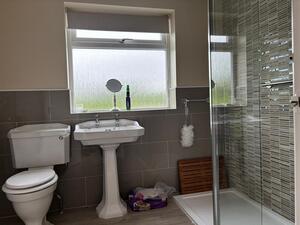 Double glazed frosted window to rear. Fitted with a corner shower cubicle, wash hand basin set on vanity with storage beneath, and low level w.c. Radiator.