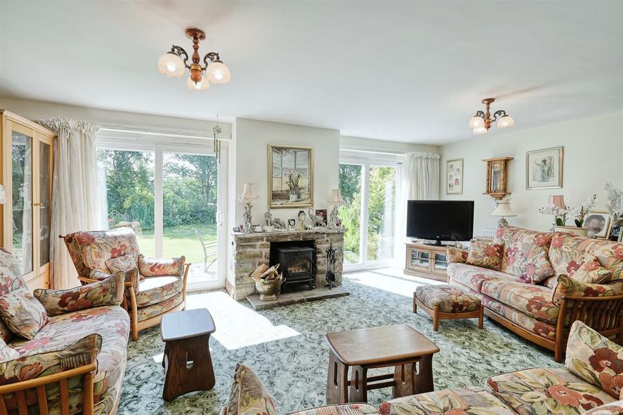 Two double glazed sliding patio doors to side,. Stone fireplace with inset log burning cast iron stove. Radiator.