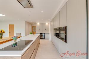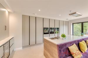 Prior to entering the kitchen, to the left is a walk in pantry with floor to ceiling shelving. The dedicated kitchen is fully fitted with pale grey tall storage units, inetgrated fridge and freezer, drinks fridge, and two built in NEFF double ovens and combi oven. There is a surprise behind one of the double storage units in the shape of a breakfast preparation area with ample power sockets for all your start of the day needs.