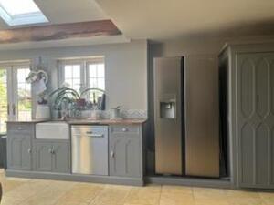 Having a pitched roof with four Velux windows, French doors to both sides and window to side. Fitted with a range of grey base units with wood block work surfaces over incorporating Belfast sink with mixer tap. Plumbed for automatic dishwasher. Four oven cream Aga set in tiled inglenook with wood mantel over. Space for American style fridge freezer. Tiled floor.