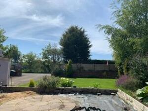 The side garden is lawned and there is a gravelled patio area with feature water fountain.