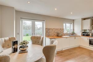 Double glazed window and double glazed French doors to side. The kitchen area is fitted with a range of wall and base units incorporating one and half bowl stainless steel sink unit, four ring gas hob with electric oven beneath and extractor hood over. Integrated fridge, freezer, dishwasher and washing machine. Part tiled walls. The dining area enjoys views over the garden. Radiator.